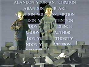 Two children are building a wall out of stones. They are blocking our view of a screen with it. The children are building the wall together in an effort to protect themselves from old beliefs. Once the whole image of the screen is gone, an adult suddenly appears and walks straight through the wall to the other side towards the screen. The new world which the children are constructing seems to have a fragile partition between the old cultural values and standards which are passed on from generation to generation in every culture on the one side, and the future on the other. A plea is being made for abandoning old models and searching for new interpretations of our cultural beliefs. Abandon your culture, your parents, your future, your ideology, your identity, your history... Abandon everything, resounds the litany. And the answer is: I have no culture, no parents, no future, no ideology, no identity, no history... There is only a future free from the old beliefs, free from set cultural references. An empty book must yet fill its pages. The children's 'tabula rasa' should be filled with other notions than old and obsolete cultural attitudes. At the end the children themselves tear down the wall and walk off the screen. However, the wall remains the border, they do not cross it. The frame freezes. There is a history behind them, a future in front of them.