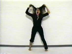 A white floor, a white wall and between both a black skirting board as transition between the two, and as only horizontal line. A woman is standing in front of the wall: across from her is the camera. The woman moves and takes on a pose and this pose relates to a certain concept. She does this not just once, the entire tape is a choreography of poses related to different moods. Her gestures are minimal and in most of the poses the woman is motionless. For instance, she raises her hands to heaven in despair, and as viewer you recognize this gesture. When someone makes a gesture like this you are meant to understand its meaning. After a bit she makes the gesture of tearing her hair out, of coughing, or letting it be known: here I am, or hey, you there. Occasionally some sound is added to emphasize the gesture. That clothing plays an important role is not forgotten in this otherwise so austere image and the clothes she is wearing fit in with the gesture she is portraying. This strengthens the feeling that the gestures she is making are the 'female versions' and that body language is tied to sex. The cartoon-like stills evoke associations with the exaggerated gestures used in silent films and seem to be icons of style and sex like those used in film/media. They seem to be the result of a process of exclusion and reduction to essentials. We see here an ironic game of associations, and with the codes relating to female identity. An amusing image drawn in black & white pantomime.