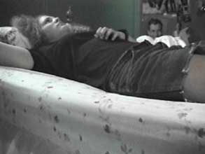 The miniature crime scene carried out in front of the monitor humorously refers to the other side of this particular segment of American society: to narrow-minded and repressive culture (walk straight and walk in line) as being the perfect breeding ground for dangerous psychopaths and teenagers who take up weapons out of frustration and gun down their schoolmates in the schoolyard.