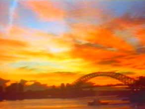 This is not the Brooklyn Bridge in New York, as one might be tempted to think initially. What we are looking at is the bridge across Part Jackson harbour in Sidney, the capitol of New South Wales in Australia. Young artist Katharine Cullen's grandfather studied the bridge carefully and photographed it amidst all the harbour activities from his quayside apartment's balcony. One hundred and seventy-two shots from 1981 to 1988 were edited and animated by his granddaughter. With enormous speed they are fired at the viewer's retina. We think of granddad Cullen on his balcony. Like a true harbour master he keeps an eye on the shipping traffic, and then becomes fascinated with the view that keeps changing with each hour of the day. Like the French impressionists and the Dutch painters of seascapes, Van de Velde and Mesdag, he is mesmerized by the changing light and the rich colours in the sky. He decides to document this view, not only in the daytime but at night as well. But however special and lovely his pictures might be, his were not the only eyes to notice this beauty. Each year thoUSAnds of tourists visit this mercantile harbour city and take the same pictures. They come from far and wide, by plane, boat or train and we hear the sounds of their transportation in the background. This short video is intended as a parody on a picture that is special and yet very common.