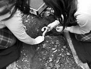 This is indeed one video with a story behind it. It all started in the theatre, in 1994, when Bardsley and Cunningham collaborated on a production of Hamlet and decided to place themselves inside the play as a magician and his assistant. Hamlet, with its play-within-a-play, marked the end of their hitherto briljant career in the theatre and the beginning of a new existence with different personae. It was around this time that a pair of dark-haired, partially deaf indentical twins (Bard and Ham Cunningsley) began to be sighted at theatres around the country that were staging productions of Hamlet or related theatrical events, appearing to be investigating some tragic events that happened some years before. Transformed by the artifice of wigs, make-up and costume they enter an authentic city - London. The sisters become the sole dramatis personae in a monochrome dumb show, embarking on an investigation into the nature of theatre, until it was time to perform the ritual murder of the two principal players. Five years later, the artists emerge, more than shadows of their former selves. The video offers sort of a condensed narration of the entire project -that was also presented as a 'memory theatre' installation with video projection, photographs and Ėtems of evidence- and is full of references to Shakespeare and Hamlet and also full of playful hints at all kinds of dichotomy, duplicity and mirror-like images. 2B or 2B, as it were.